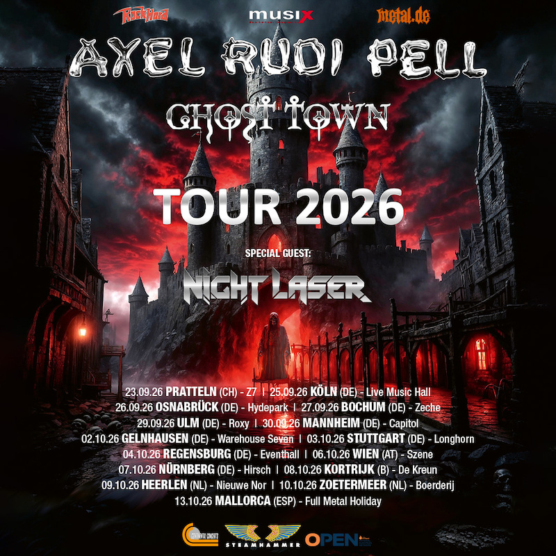 Für die Musik des Bochumer Gitarristen, Komponisten und Bandleaders Axel Rudi Pell braucht man weder Lexikon noch Navigationsgerät. Denn das, was vermutlich auf nahezu alle erfolgreichen Musiker zutrifft, gilt auch für Pell: Seine Songs tragen eine für ihn typische, jederzeit charakteristische Handschrift, ein Hybrid aus kraftvollen Gitarrenriffs und eingängigen Melodien sowie dem Fundament einer bravourös agierenden Band um den amerikanischen Sänger Johnny Gioeli, Ex- Rainbow-Drummer Bobby Rondinelli, Bassist Volker Krawczak und Keyboarder Ferdy Doernberg. Und obwohl Pell seine Fans mit dieser signifikanten Mischung bereits seit weit mehr als 35 (!) Jahren begeistert, findet man auf seinen Alben immer wieder raffinierte Überraschungen oder bemerkenswerte Kooperationen. Auch auf seiner aktuellen Studioscheibe ‚Ghost Town‘ steht fest: Axel Rudi Pell vergrößert die lange Liste großartiger Songs seiner Karriere um weitere elf Exponate. Und diese wird er im Rahmen der großen „Ghost Town Tour 2026“ live vorstellen.