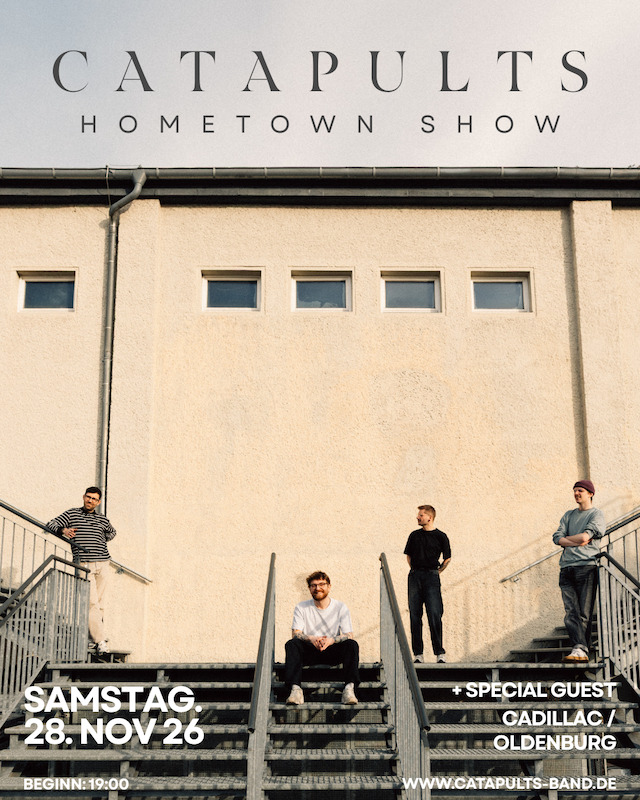 Zuhause ist es eben immer am schönsten. Jeden November nistet sich die Emo/Alternative Band Catapults für einen Abend im oldenburgischen Cadillac ein, um im intimen Heimspiel mit Friends, Family und Fans das Jahr zum Abschluss zu bringen. 2022 als Pre-Weihnachtskonzert begonnen und durch einen Handschlagvertrag mit dem Kulturzentrum als Dauerlocation besiegelt, ist aus der winterlichen Hometown Show eine waschechte Tradition geworden. So auch dieses Jahr, am 28. November 2026 kommen Catapults fürs Jahresabschlusskonzert zurück auf die Cadillac Bühne.