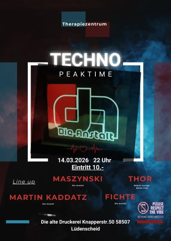 Die nächste Tanztherapie steht an! Am 14.03. lädt Die Anstalt wieder zur Techno Therapie in den Stock ein. Nach den letzten zwei starken Partys wollen wir genau dort weitermachen, wo wir aufgehört haben – und gemeinsam mit euch wieder eine exzessive Nacht zelebrieren. Zur Verstärkung kommt Thor, der bei der letzten Party krankheitsbedingt leider absagen musste. Dieses Mal steht er aber endlich an den Reglern. Seit 2004 ist Thor fester Bestandteil der elektronischen Musikszene. Neben seiner Residency beim Vibez Magazine spielte er zahlreiche Gigs in Deutschland und der Schweiz. In unseren Breitengraden kennt man ihn besonders durch seine eigene Partyreihe in der Redcat Lounge im Raum Köln sowie durch Auftritte im legendären Butan Club in Wuppertal. Thor steht für dramaturgisch aufgebaute Sets und druckvollen Peak-Time-Techno. Der Support kommt wie gewohnt von den anstaltseigenen Haustherapeuten Fichte, Maszynski und Martin Kaddatz, die euch mit treibenden Sounds versorgen werden. Lasst euch von den Therapeuten der Anstalt in eine Nacht voller Techno und spezieller Blacklight-Deko entführen. 📍 Location: Der Stock Knapperstr. 50, 58507 Lüdenscheid 🕙 Start: 22:00 Uhr ❗ab 18 Jahren (keine Muttizettel) Kommt früh – die ersten 50 Gäste erhalten einen Begrüßungsshot 🍸 Aktion 🍾von 22:00-24:00 Uhr Salitos 3,50€ 🖤 Blacklight-Deko: by Die Anstalt 🎶 Line-up: Thor (Redcat Lounge / Butan Club) Fichte (Die Anstalt) Martin Kaddatz (Die Anstalt) Maszynski (Die Anstalt) #rave #techno #lüdenscheid #derstock #clubnight #dieanstalt<br><br>Thor (Redcat Lounge Köln, Butan Club Wuppertal Maszynski (Die Anstalt) Fichte (Die Anstalt) Martin Kaddatz (Die Anstalt)