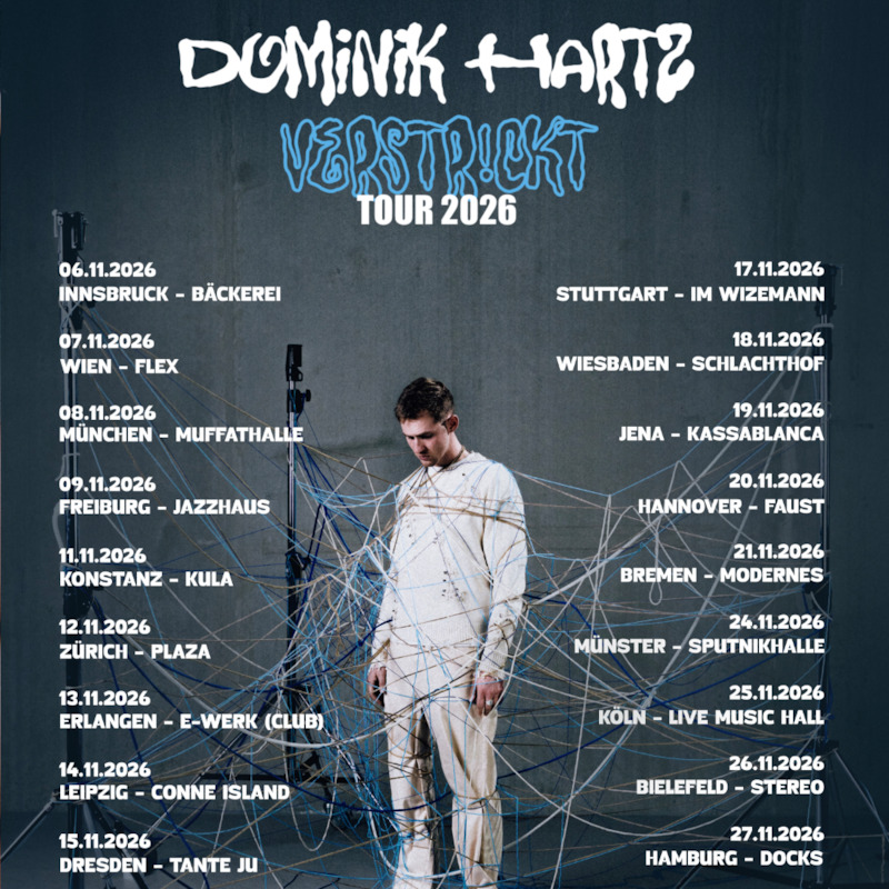 Es ist viel passiert bei Dominik Hartz: Das erste Album, eine ausverkaufte Albumtour, und zahlreiche Festivalauftritte wie beim Deichbrand, Highfield, San Hejmo oder der Winterthurer Musikfestwochen. 2026 meldet sich Dominik Hartz endlich mit der verstr!ckt Tour zurück: Mit im Gepäck: sein gleichnamiges neues Album, inklusive der Single “Fast vergessen” feat. jolle.