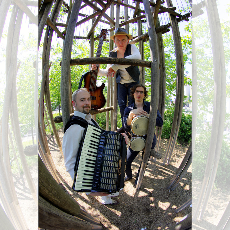 Die global shtetl band verbindet mühelos musikalische Traditionen vom Schwarzen Meer bis Kolumbien, mit Umwegen über Polen, New York und Kuba… Ihre Musik ist eine Verschmelzung von Klezmer- und Balkantraditionen mit Cumbia, Salsa, Son, Bolero… Ihr Repertoire reicht von verschollen geglaubten jiddischen Texten bis hin zu neuem, aktuellem Songwriting, sie erzählen Geschichten für Herz und Hirn und bewegen die Tanzbeine. Mit Bartek Stanczyk — Akkordeon, Gesang; Markus Milian — Bass, Gitarre, Gesang; Daniel Piccon — Percussion, Gesang. Und als besonderer Gast: Gustavo Mendoza — Flöte, Gesang