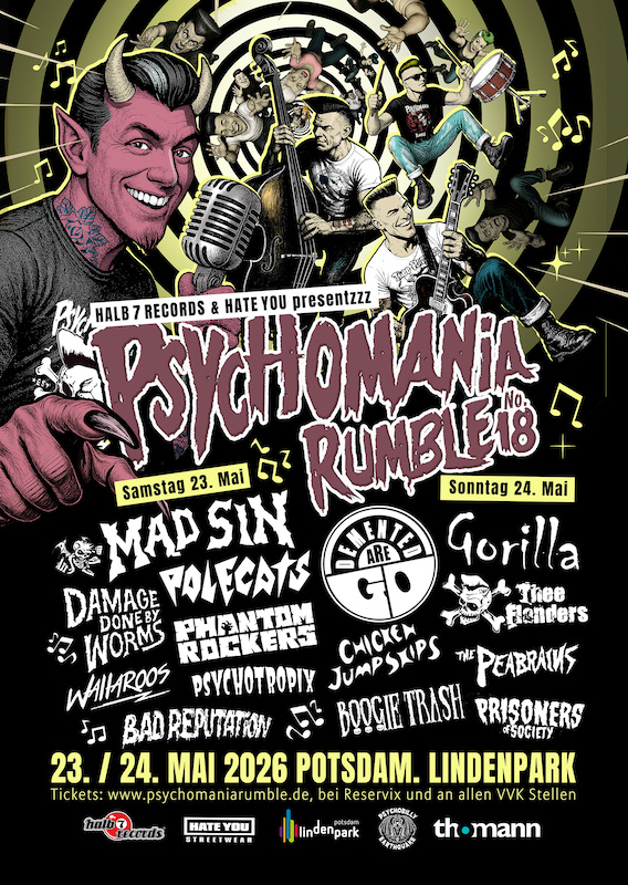 The date is set and confirmed: Traditionally during Pentecost – so mark May 23rd and 24th, 2026 in red on your calendars. We’ll see you at Lindenpark in good old Potsdamend! The PSYCHOMANIA RUMBLE remains the largest and most enduring Psychobilly festival in Eastern Germany... we’re ready for another home game, meaning the madness continues!